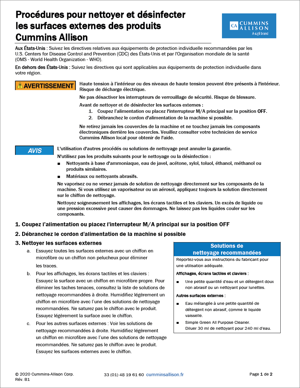 Home > More products > General information > Cummins Allison Products | User Guide, External Surface Clean, Disinfect | French