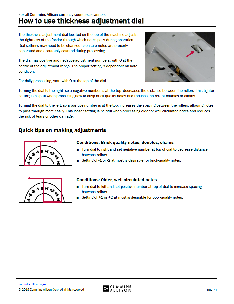 Home > More products > General information > Cummins Allison Note Counters, Scanners | User Guide, Thickness Adjustment Dial | English