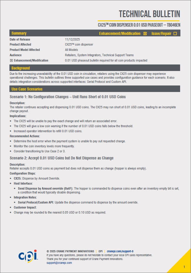CX25 | Technical Bulletin, 0.01 USD Coin Phaseout | English