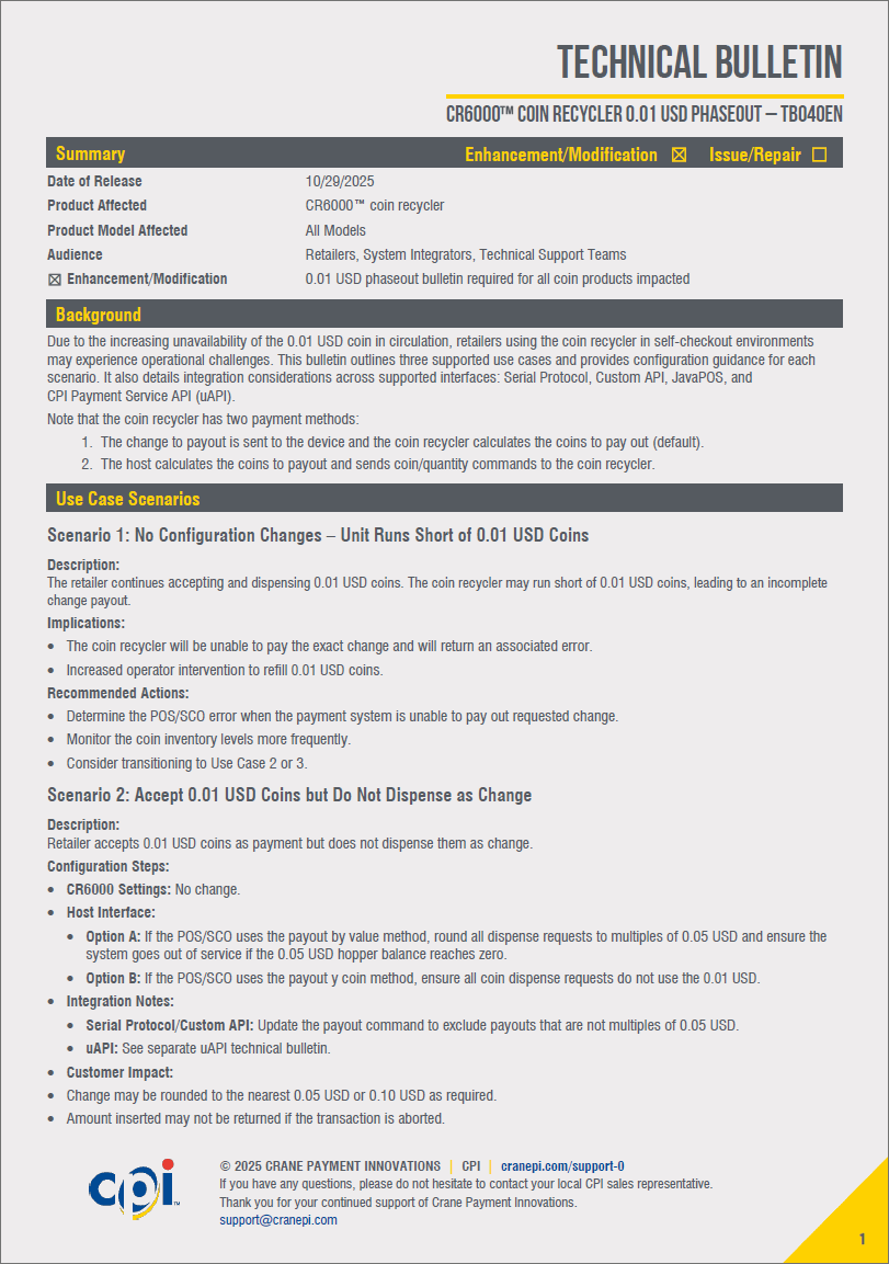 CR6000 | Technical Bulletin, 0.01 USD Coin Phaseout | English
