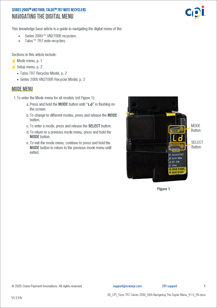 Home > Note products > Note validators > Talos™ note validators and note recycler > Series 2000 VN2700R, Talos TR7 | Article, Navigating Digital Menu | English