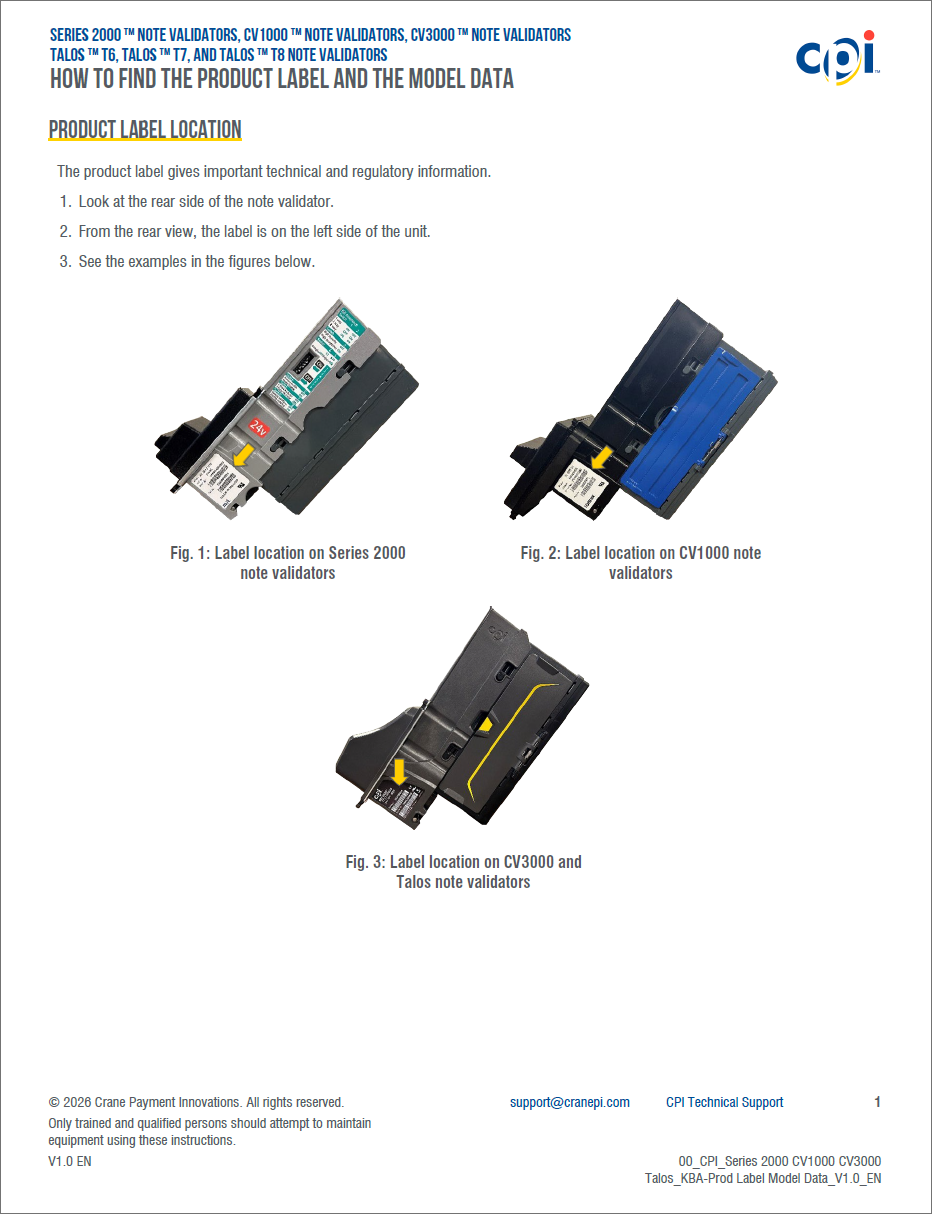 Home > More products > Legacy products > Series 2000™ note validator and note recycler > CV1000, CV3000, Series 2000, Talos T6 T7 T8 | Article, Product Label, Model Data | English