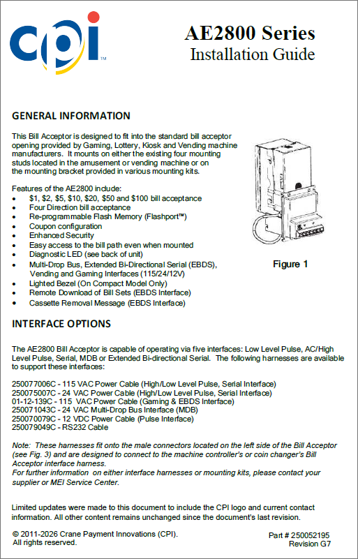 Home > More products > Legacy products > Series 2000™ note validator and note recycler > Series 2000 AE2800 | Technician Guide, Installation | English
