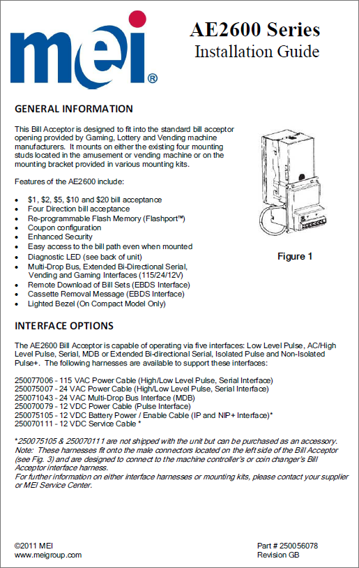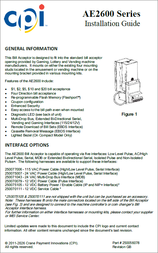 Home > More products > Legacy products > Series 2000™ note validator and note recycler > Series 2000 AE2600 | Technician Guide, Installation | English