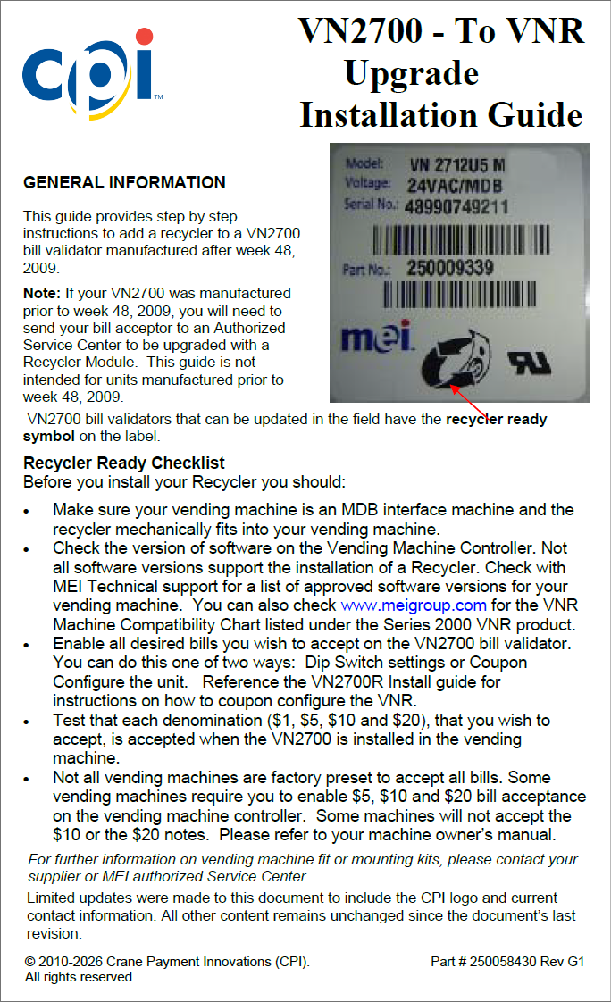Home > More products > Legacy products > VNR™ note recycler > Series 2000 VN2700 | Technician Guide, VNR Installation | English