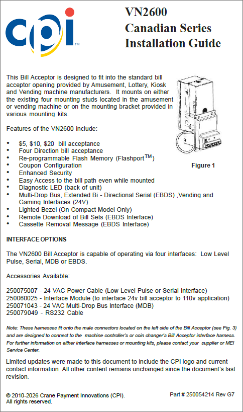 Home > More products > Legacy products > Series 2000™ note validator and note recycler > Series 2000 VN2600 Canadian Series | Technician Guide, Installation | English