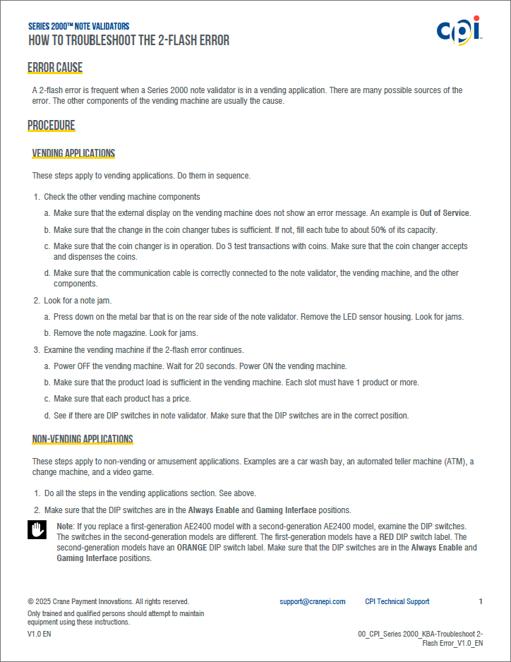 Home > More products > Legacy products > Series 2000™ note validator and note recycler > Series 2000 | Article, Troubleshooting 2-Flash Error | English